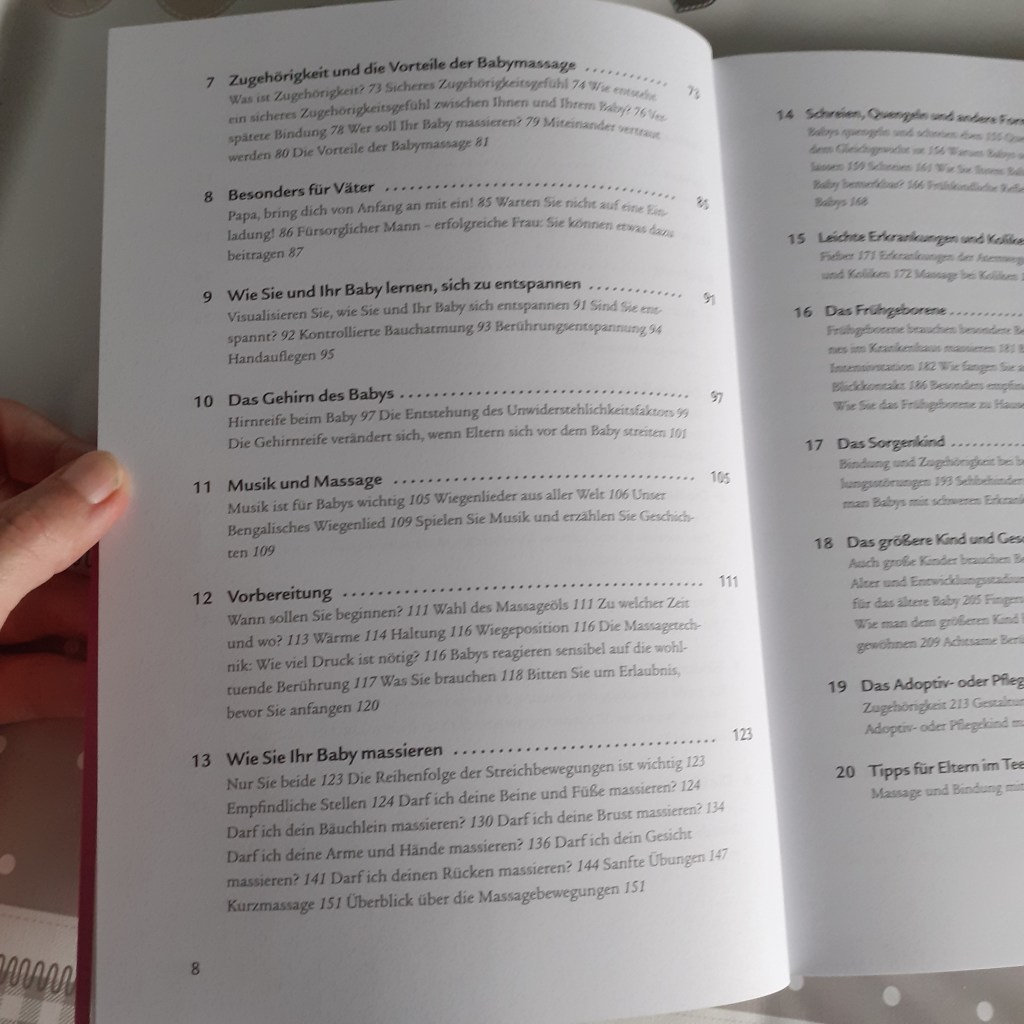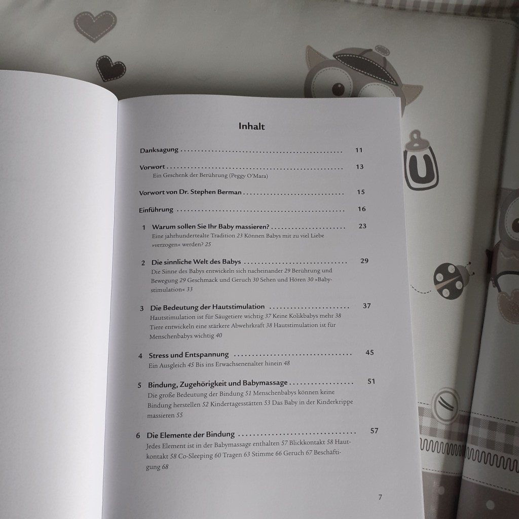Es gibt viele Werke über das Thema Babymassage, aber nur wenige sind so umfassend wie dieses Buch. Auf 237 Seiten wird Theorie und Praxis vermittelt, wobei hier nicht nur auf die Babymassage eingegangen wird. Viel mehr wird sie als Teil des Bindungsaufbaus sowie der kindlichen Entwicklung gesehen. Beide Themen werden ausführlich, aber im Rahmen, beschrieben.