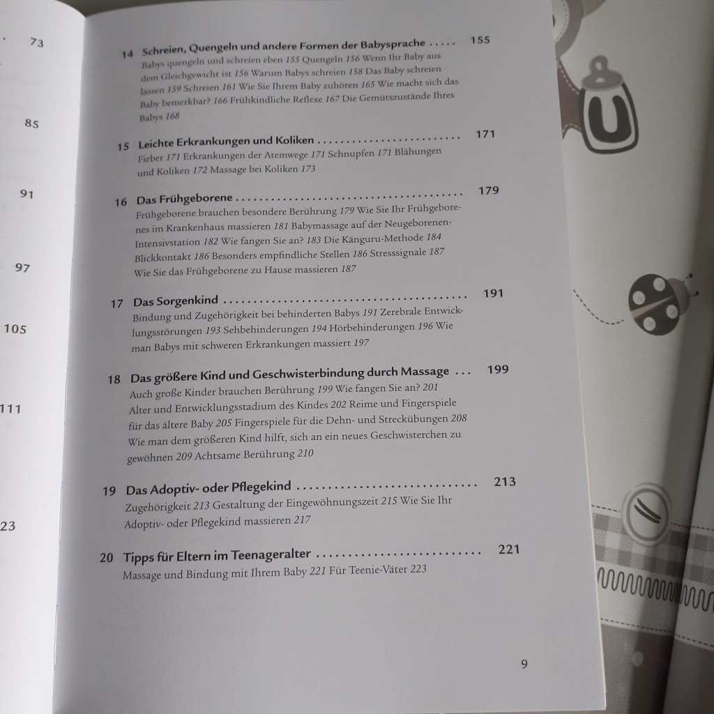 - Das Buch sieht das Baby als kompetent und Individuum an! Damit haben auch Eltern das Kind vorher zu „fragen“ ob es massiert werden will. Die Massage soll nicht als muss angesehen werden. Abbruch ist keine Schande.